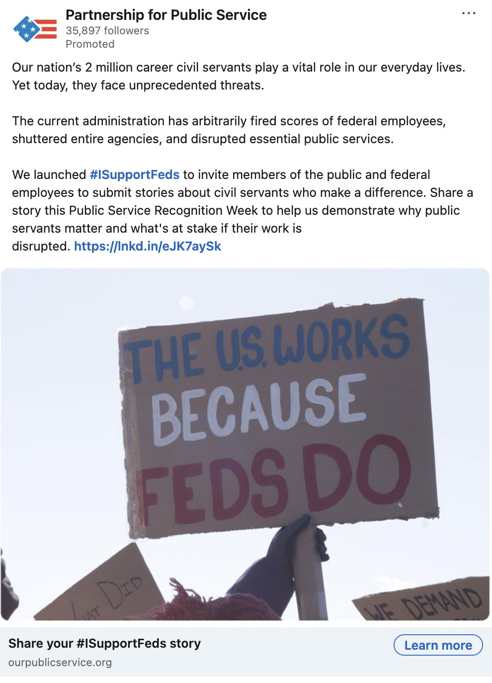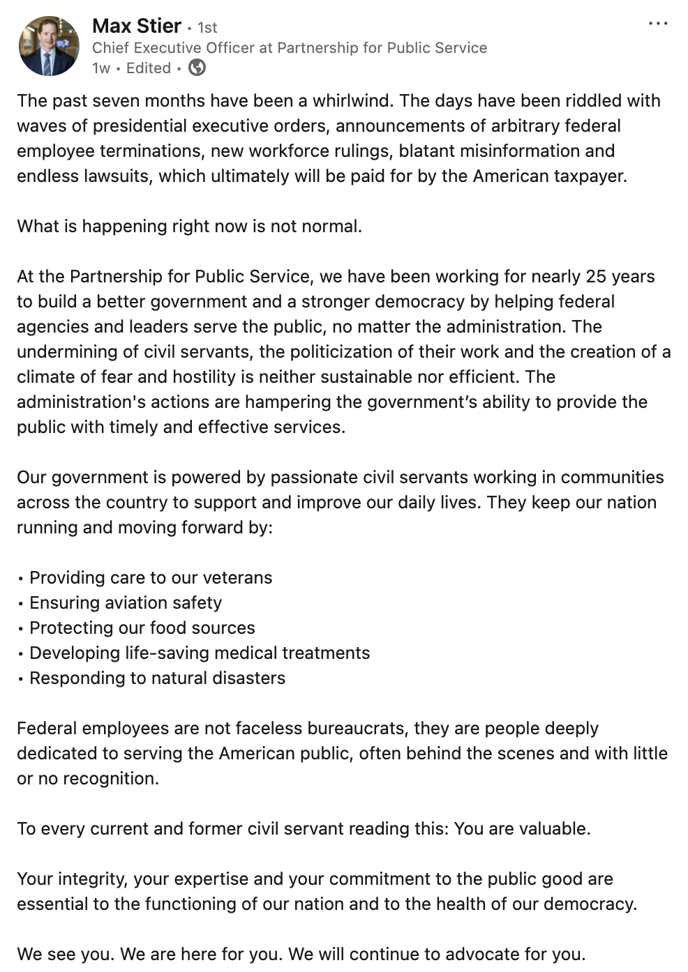 After the unexpected leave of my team’s social media manager, I have been the primary author and manager of the Partnership’s CEO’s social media profiles. I took the approach to establish the CEO as a trusted messenger in civil servant advocacy, democracy, public policy and government reform on LinkedIn to educate the general public of government cuts and the harms that will eventually affect American taxpayers.